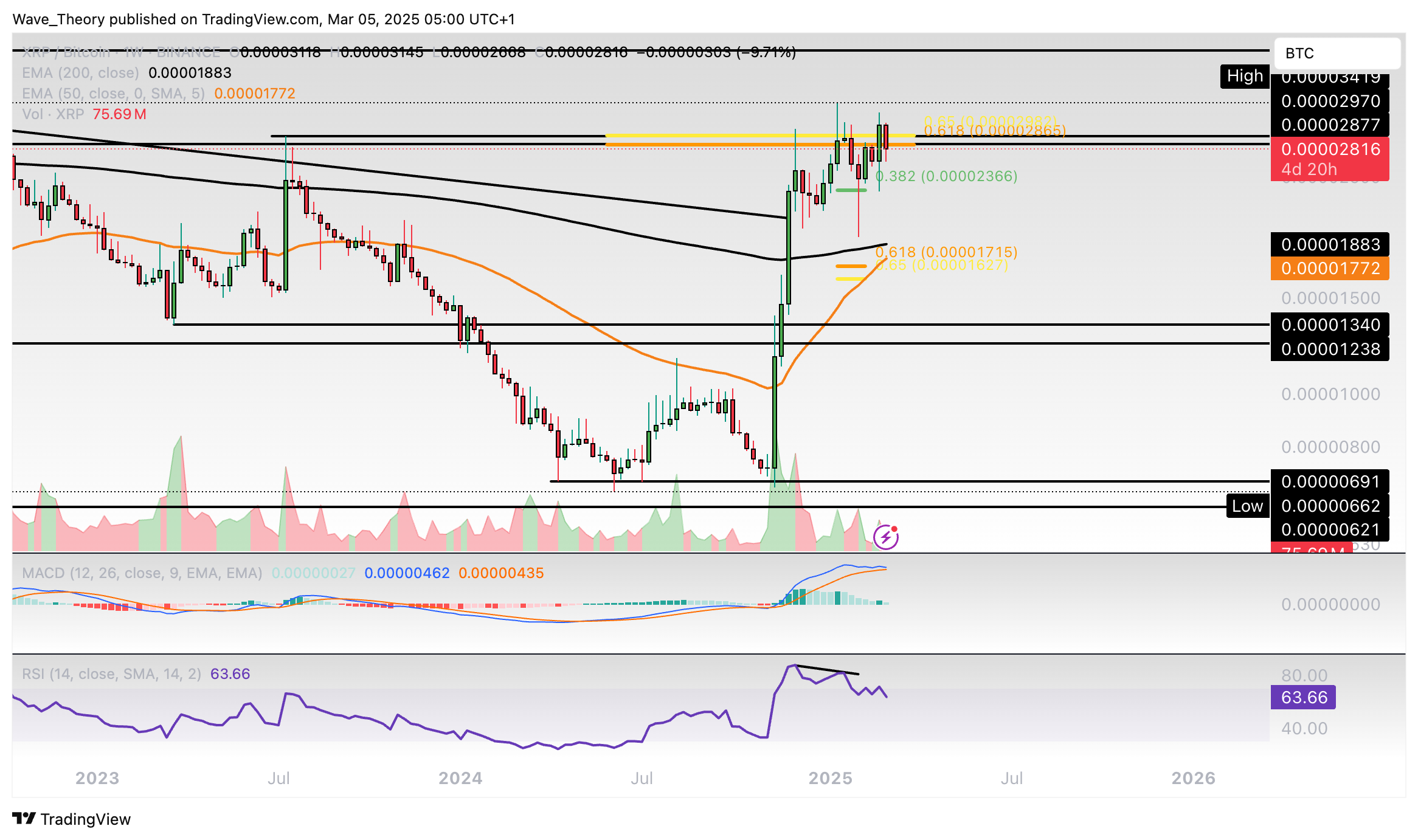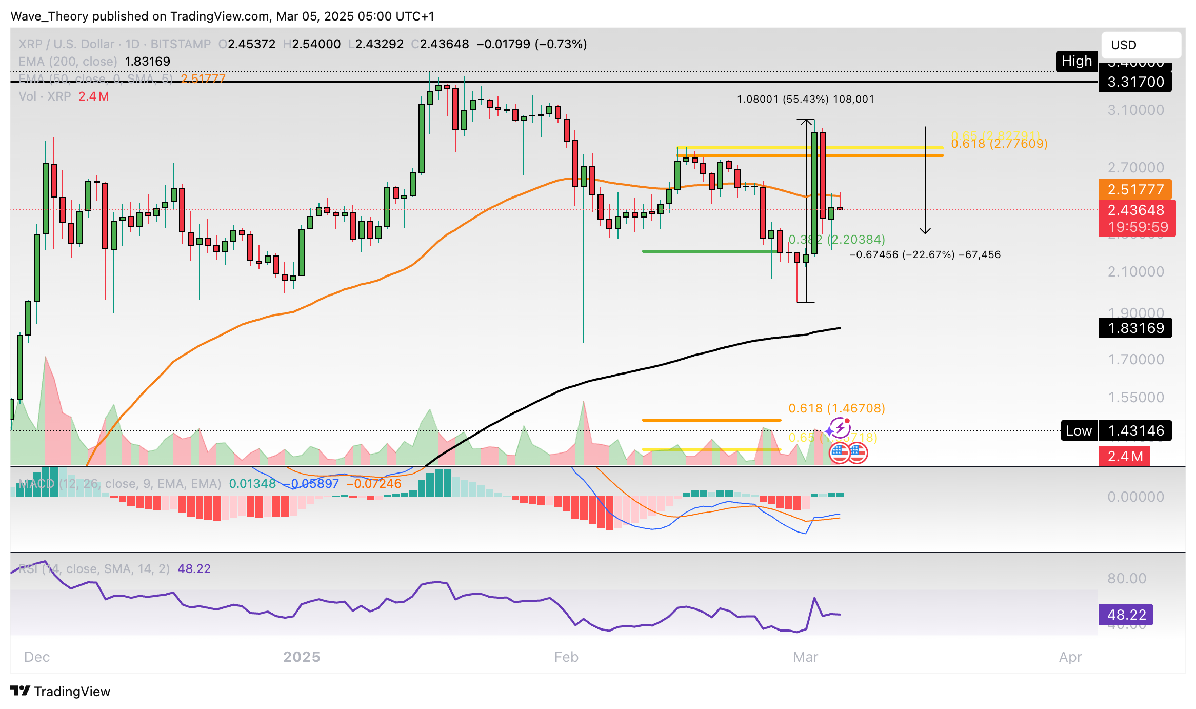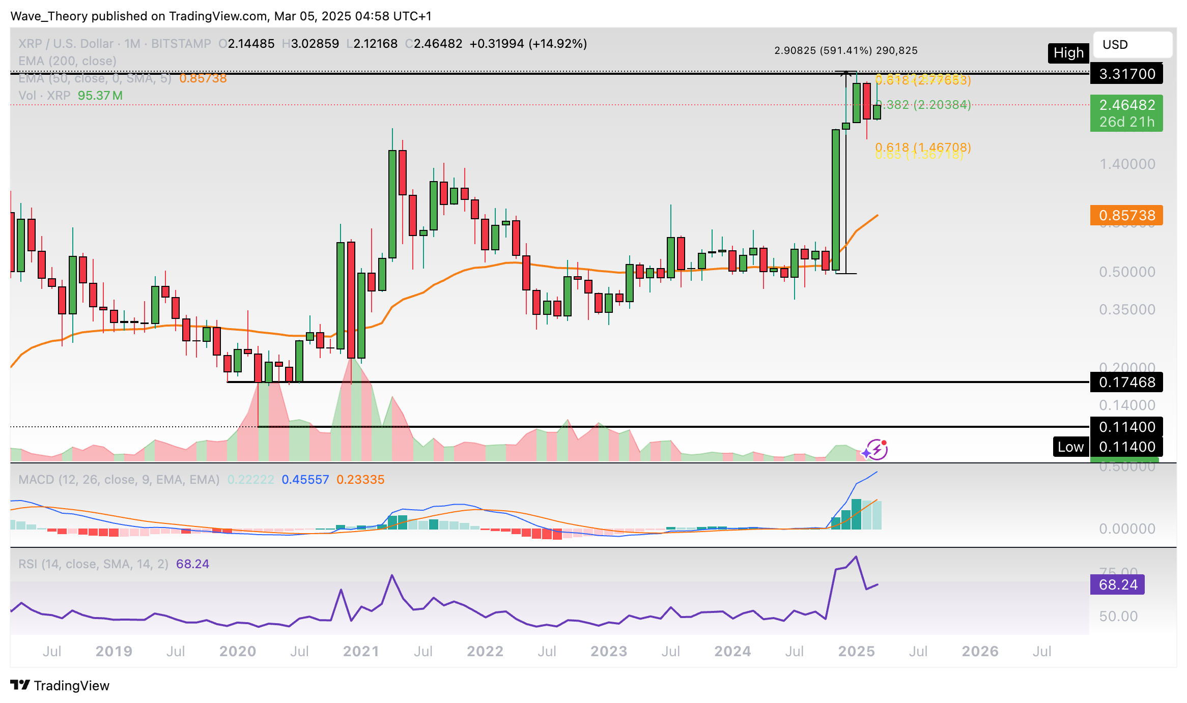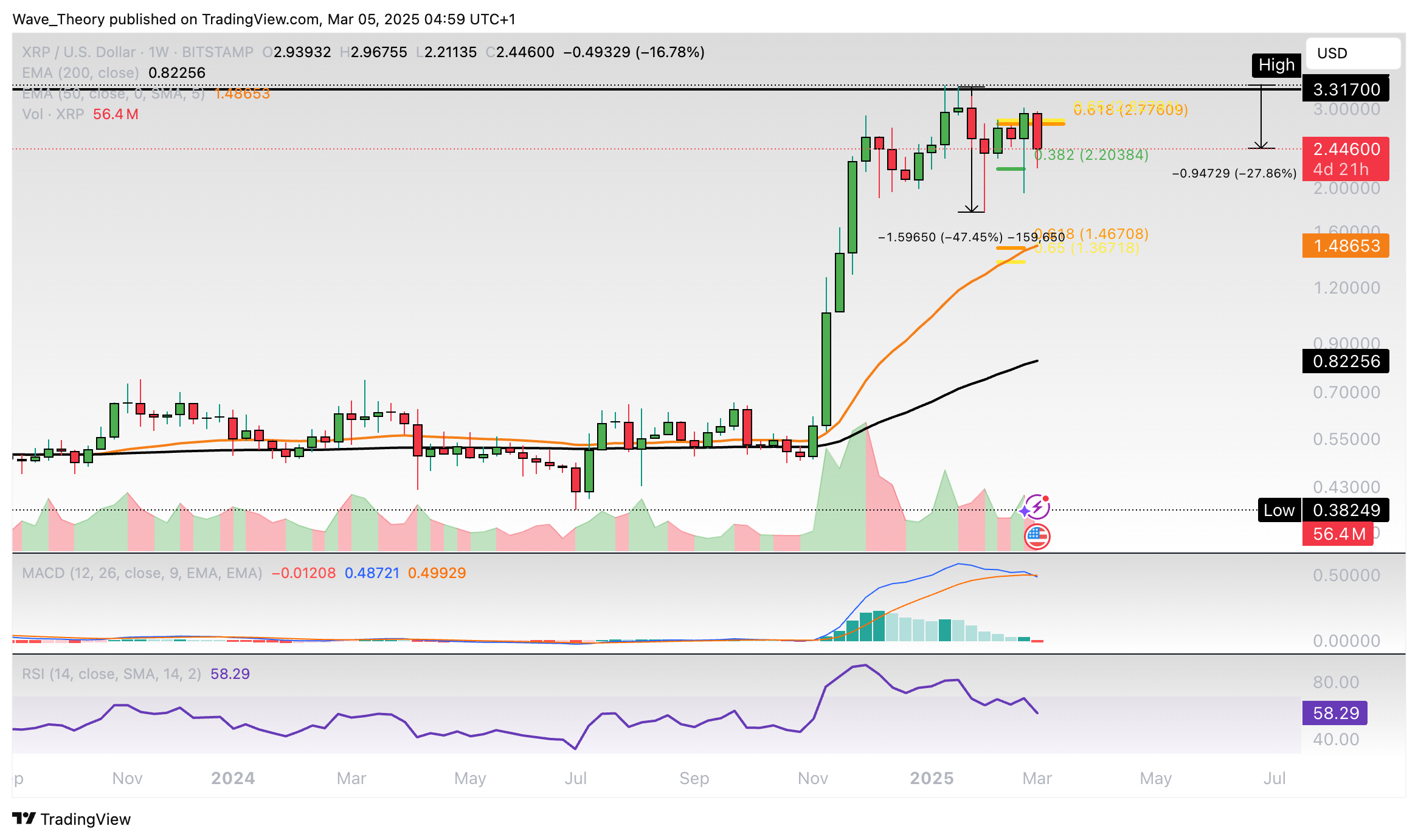 Sollte sich XRP nicht über der 0,382 Fib Unterstützung bei rund 2,2 USD halten können, könnte der Kurs zur Golden Ratio Unterstützung bei rund 1,45 USD korrigieren. Dort fungiert zudem der 50-Wochen-EMA als zusätzliche Unterstützung.