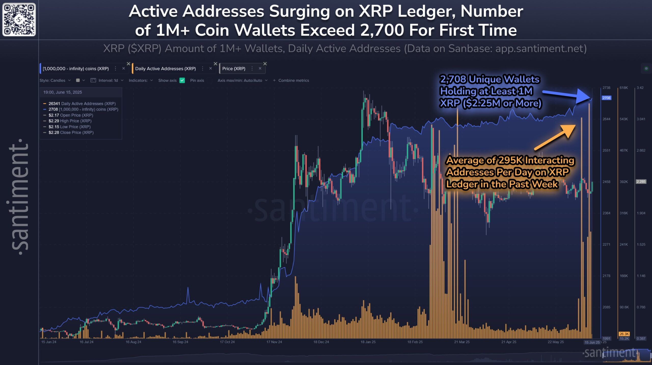 Laut den neuesten Daten von Santiment überstieg die Anzahl der täglich aktiven XRP-Adressen in der vergangenen Woche 295.000. Das ist mehrere Male höher als der Durchschnitt von 35.000–40.000 Adressen pro Tag in den letzten drei Monaten.