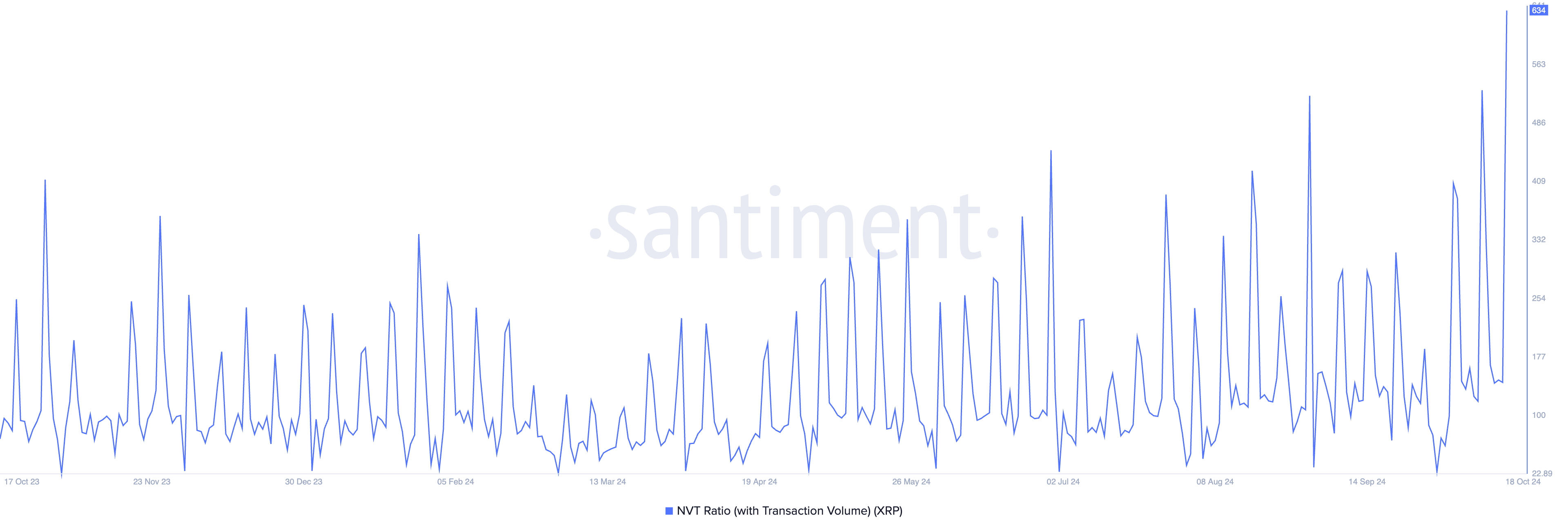 Dieser Kursrückgang wurde von einem Anstieg des NVT-Verhältnisses von XRP begleitet. Das NVT-Verhältnis, das bewertet, ob ein Vermögenswert über- oder unterbewertet ist, indem es seine Marktkapitalisierung mit dem Transaktionsvolumen vergleicht, hat ein Jahres-Hoch von 634 erreicht.