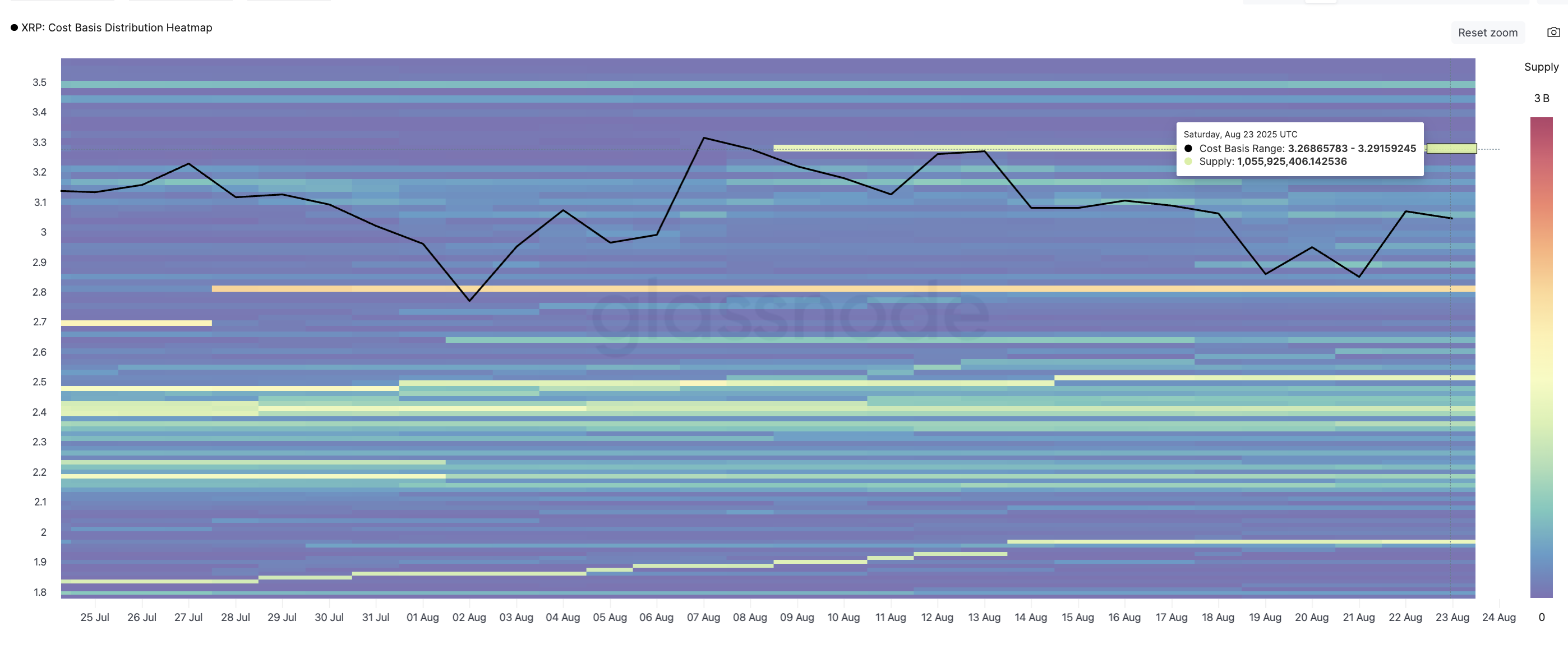 Der dichteste Cluster befindet sich derzeit zwischen 3,26 USD und 3,29 USD, wo mehr als 1,05 Mrd. XRP akkumuliert wurden.