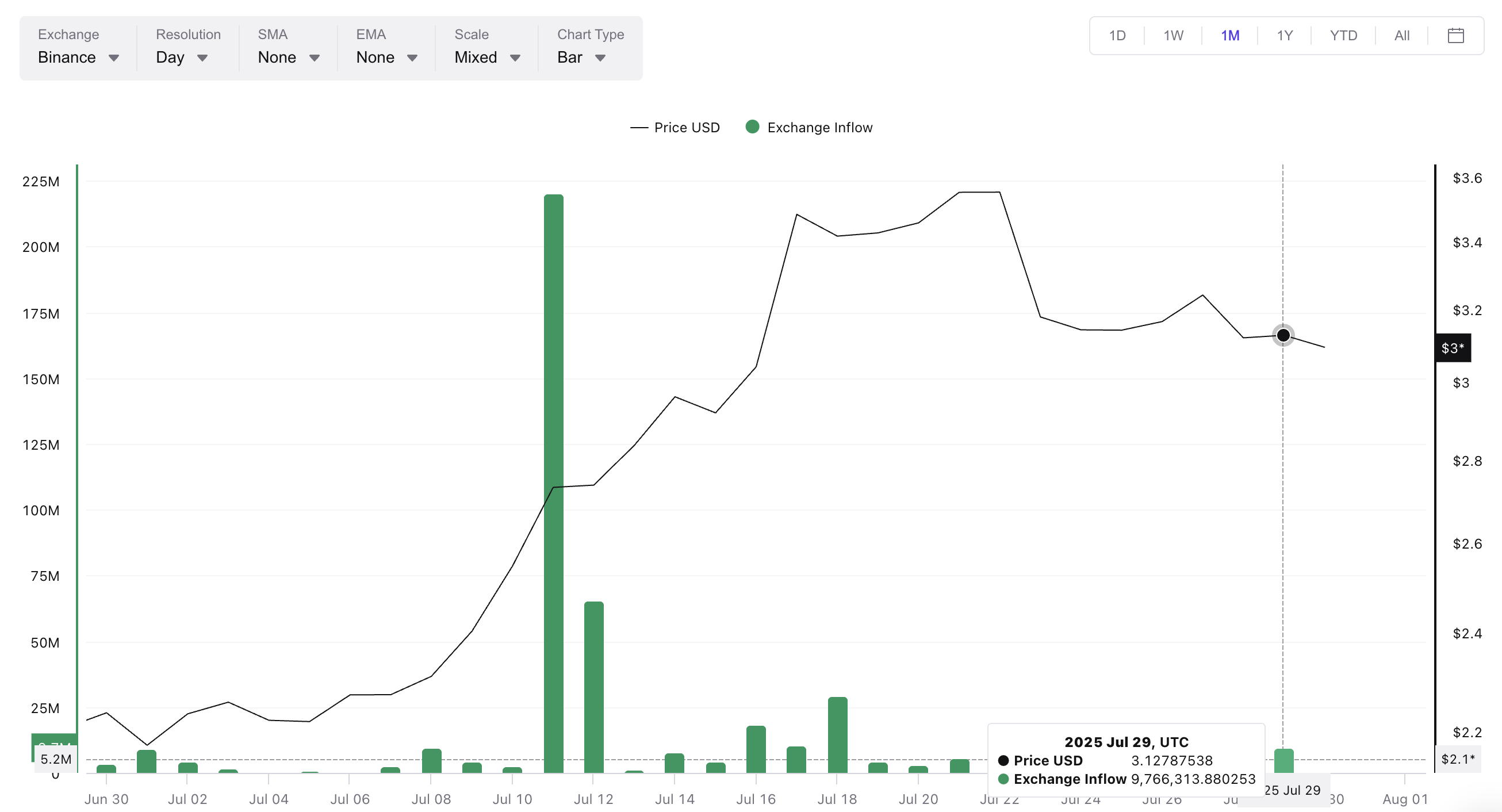 Die neuesten Daten zeigen, dass die XRP-Zuflüsse zu Börsen im Juli größtenteils verhalten blieben. Der einzige größere Anstieg erfolgte am 11. Juli, als über 220 Millionen XRP auf Handelsplattformen eintrafen. Seitdem bewegen sich die Zuflüsse meist auf niedrigem Niveau. Die jüngsten Daten vom 29. Juli zeigen, dass nur 9,7 Millionen XRP zu Börsen flossen, während der XRP-Kurs bei etwa 3,12 USD gehandelt wurde.