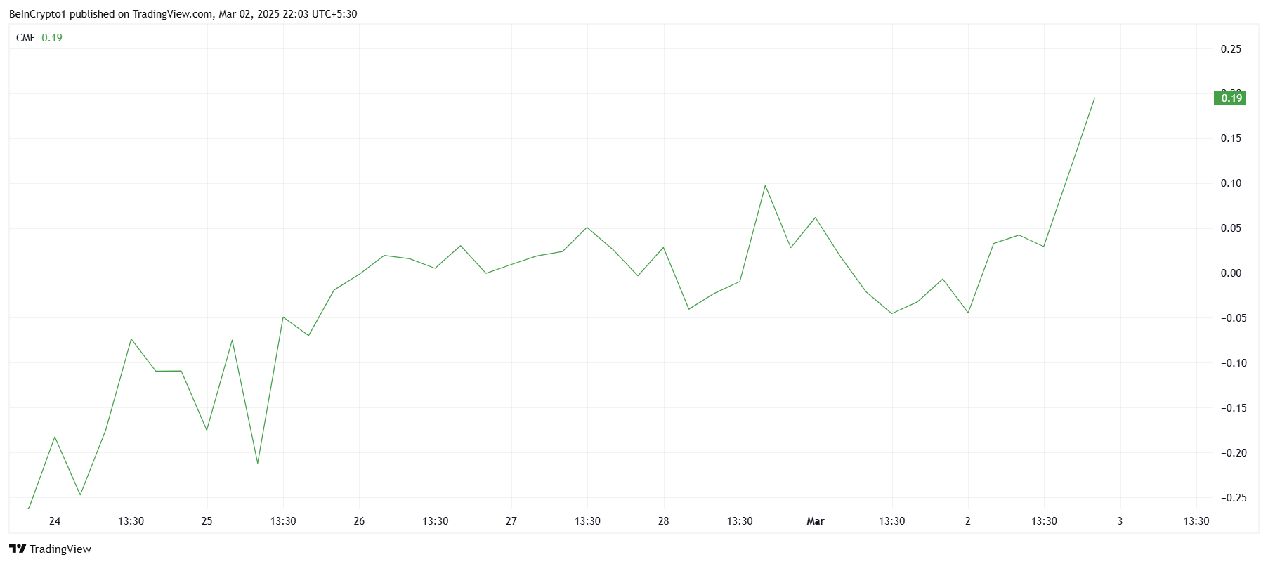 Der Chaikin Money Flow (CMF) Indikator bestätigt ebenfalls die positive Marktstimmung rund um XRP. Der CMF zeigt einen starken Anstieg, was darauf hindeutet, dass Investoren Ripple aufstocken. Dieser Anstieg ist wahrscheinlich auf die Ankündigung von Trump zurückzuführen, die dem Altcoin einen großen Schub an Zuflüssen gegeben hat. Da der CMF weiter steigt, verstärkt er den Aufwärtstrend und deutet darauf hin, dass der Kurs weiter steigen könnte.