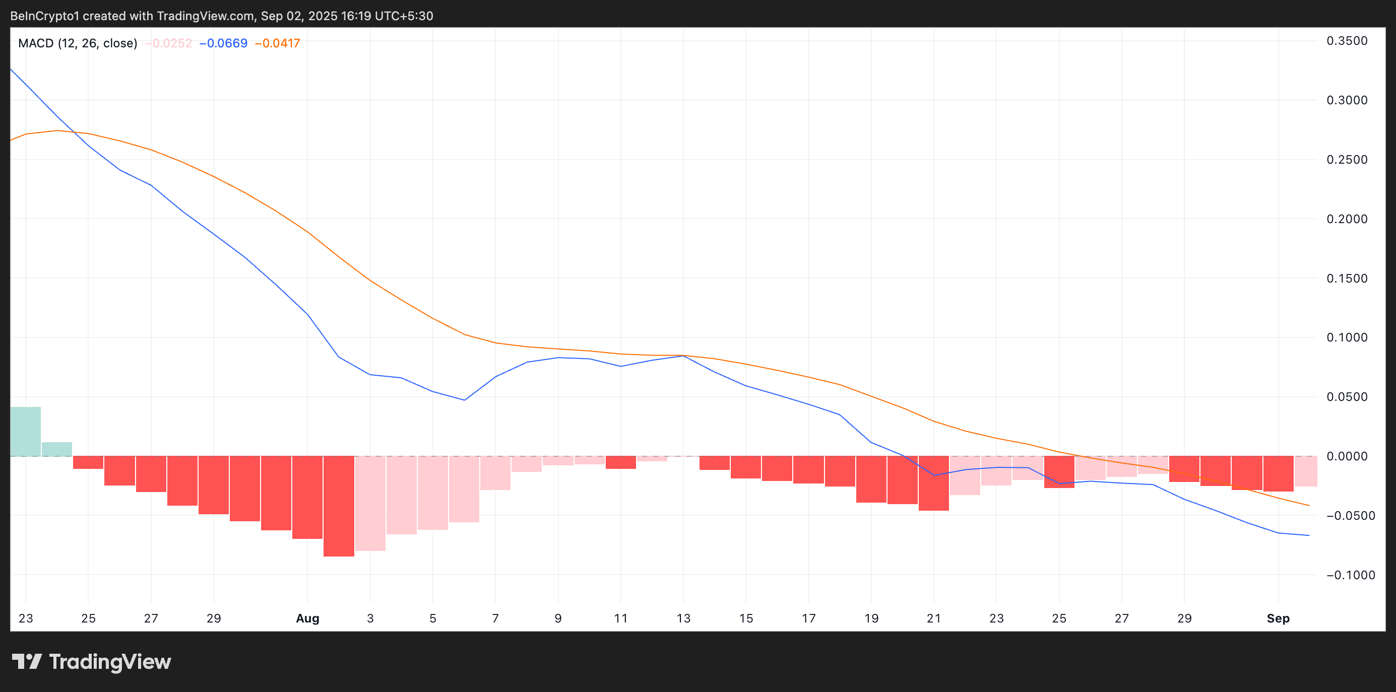 Darüber hinaus unterstützt die Konfiguration des Moving Average Convergence Divergence (MACD)-Indikators des Altcoins diesen bärischen Ausblick. Zum Zeitpunkt der Veröffentlichung liegt die MACD-Linie (blau) von XRP unter der Signallinie (orange) und befindet sich seit dem 25. Juli in dieser Position.