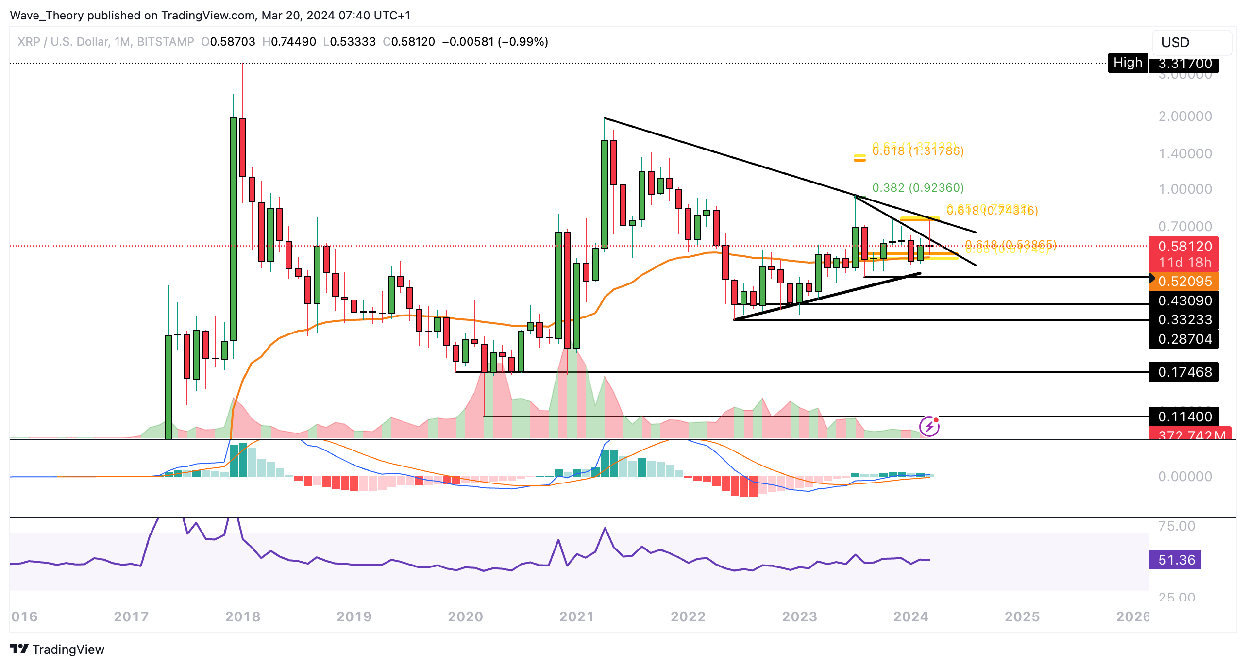 Derzeit stößt XRP auf eine beträchtliche Fibonacci-Unterstützung, die sich um 0,52 $ befindet. Außerdem bietet der 50-monatige Exponential Moving Average (EMA) auf diesem Niveau zusätzliche Unterstützung.