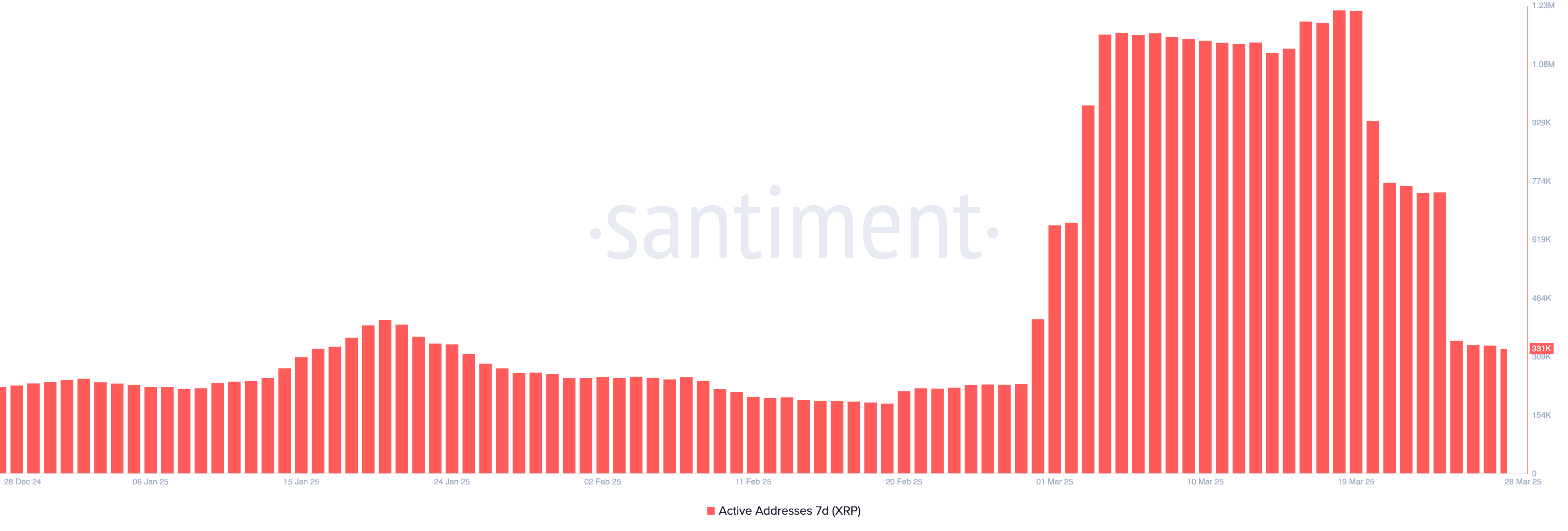 Die 7-Tage-Aktivadressen von XRP haben in der vergangenen Woche einen starken Rückgang erlebt, nachdem sie kürzlich auf neue Allzeithochs gestiegen waren. Am 19. März erreichte die Kennzahl mit 1,22 Millionen ihren Höhepunkt, was auf starke Netzwerkaktivität und Nutzerengagement hinweist.