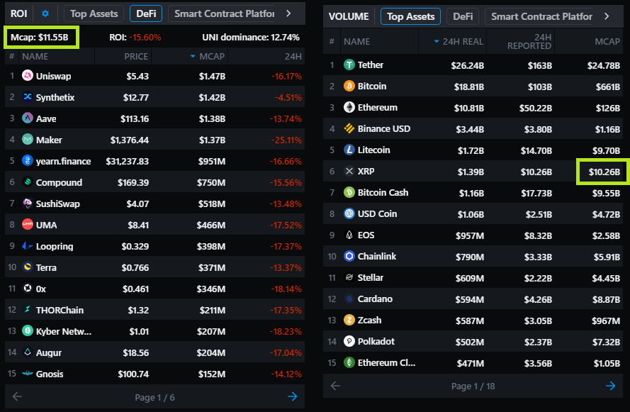 Die Daten von Messari zeigen, dass die Gesamtmarktkapitalisierung des DeFi-Sektors (11.5 Milliarden USD) die von XRP (10.26 Milliarden USD) im Laufe der aktuellen Korrektur im Kryptomarkt überstiegen hat.