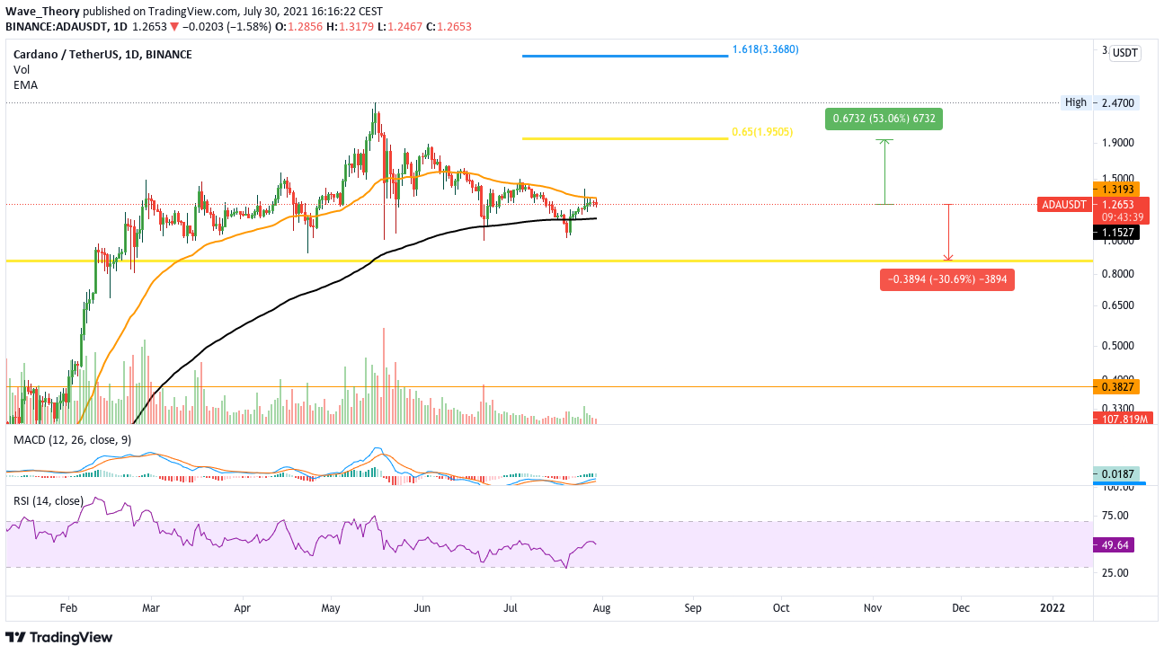 Zudem durchbrach der ADA Preis bisher auch nicht die Golden Ratio Unterstützung, sondern fand am 200-Tage-EMA Unterstützung, welche bei 1,15 USD liegt. Aktuell kämpft der ADA Kurs aber mit dem 50-Tage-EMA bei 1,31 USD, welcher als Widerstand fungiert. Sollte dieser gebrochen werden, könnte der Cardano Preis rund 53 % in die Höhe schießen, um seinen nächsten Fibonacci Widerstand bei 1,95 USD anzuvisieren.