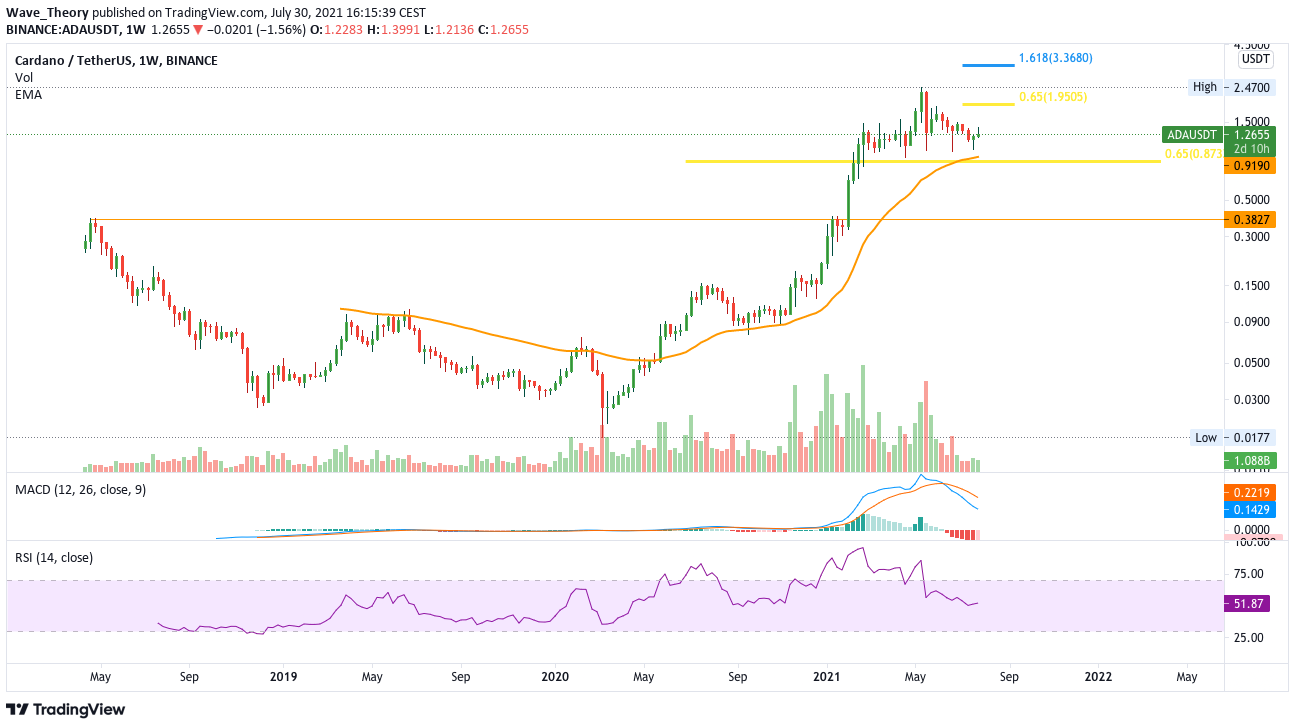 Am Trend von Cardano hat sich seit dem Bullrun Anfang 2021 nichts geändert. Der Trend ist unverändert bullisch, und die bisherige Abwärtsbewegung von rund 60 % entspricht noch einer gesunden Korrektur. Sofern nämlich die Golden Ratio Unterstützung bei 0,87 USD nicht durchbrochen ist, bleibt der Trend bullisch. Genau dort liegt zusätzlich der 50-Wochen-EMA, welcher als zusätzliche Unterstützung dient. Sollte der Cardano Preis den Fibonacci Widerstand bei 1,95 USD brechen können, stünden die Chancen gut für einen Anstieg auf ein neues ATH – bei knapp 3,37 USD.