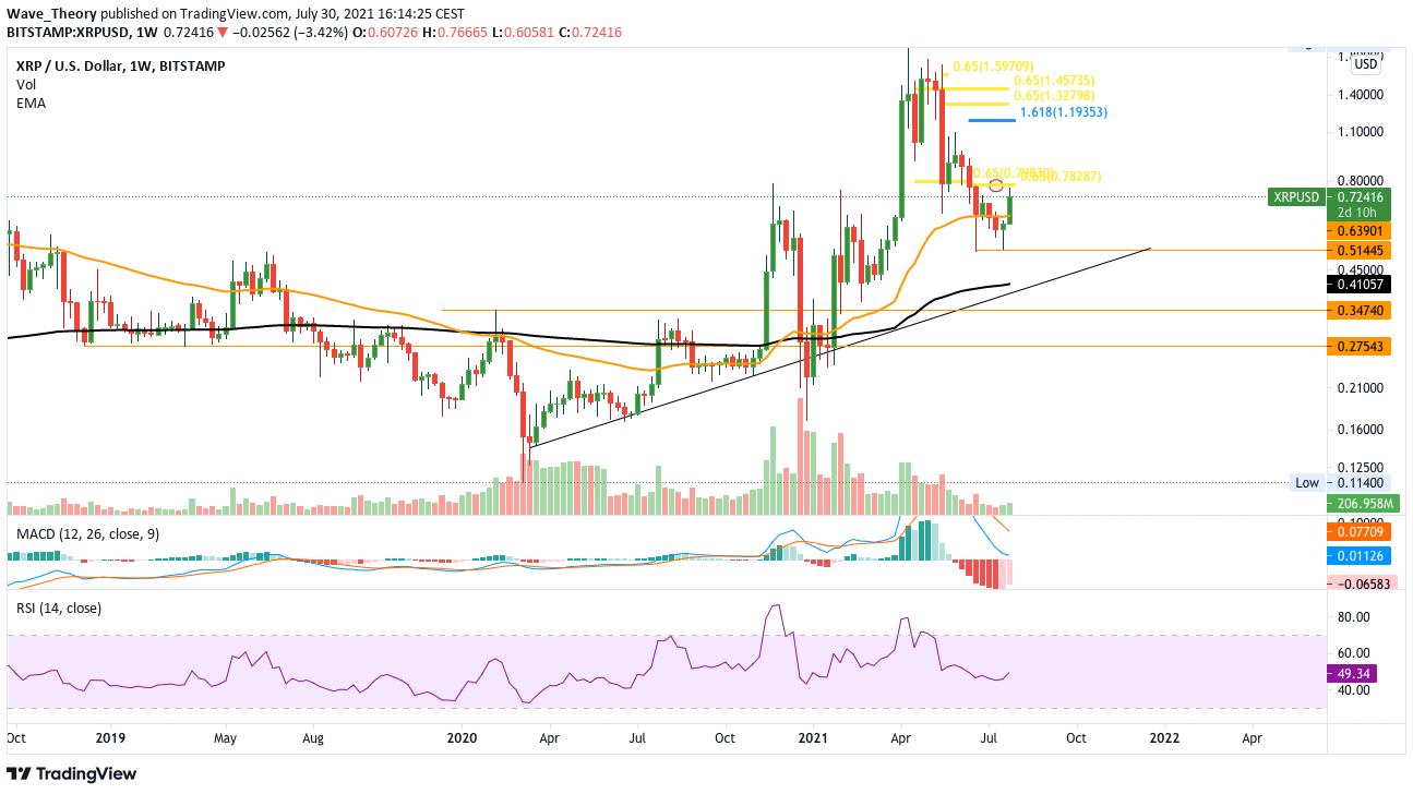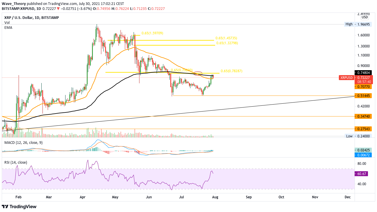 Bei einem bullischen Bruch dieses Widerstands bei 0,75 USD könnte der Ripple Kurs aber bis knapp 1,2 – 1,5 USD steigen.