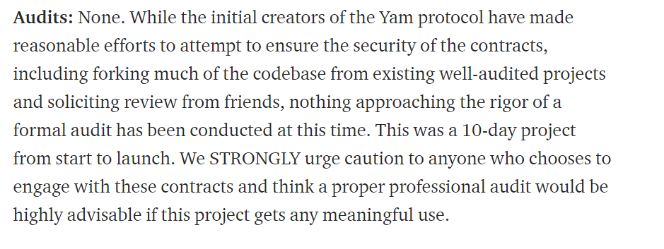 Yam Finance hat einige Lektionen bereits gelernt. Derzeit bereitet Yam die Migration auf eine neue Plattform vor, deren Smart Contracts von der Community ausgiebig geprüft werden sollen. Zu diesem Zweck hat die Yam über 75.000 USD an Spendengeldern eingesammelt, welche an die Prüfer verteilt werden. Auf der neuen Plattform gibt es dann weder Rebases, noch On-Chain Governance.