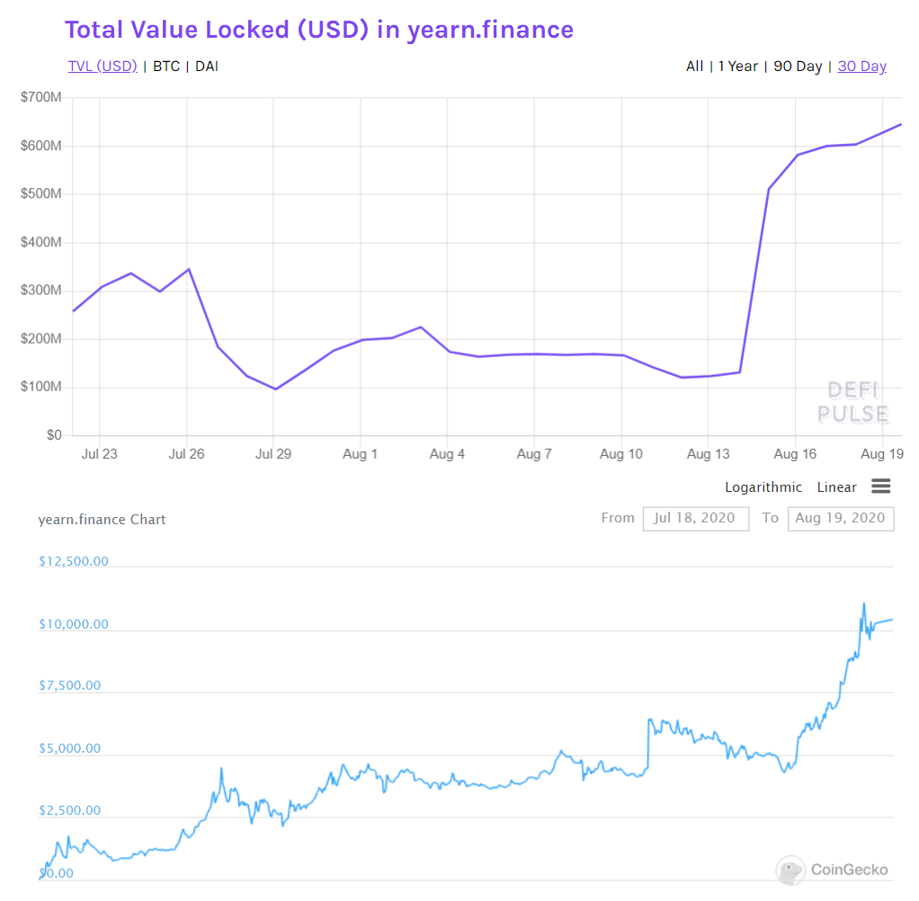 Der Preis der Tokens korreliert daher oft mit der angelegten Summe (“Total Value Locked” = TVL) auf der Plattform. Seit dem 14. August gab es einen deutlichen Anstieg der TVL auf yearn.finance auf knapp das fünffache. Der Preisanstieg von YFI folgte kurz danach.