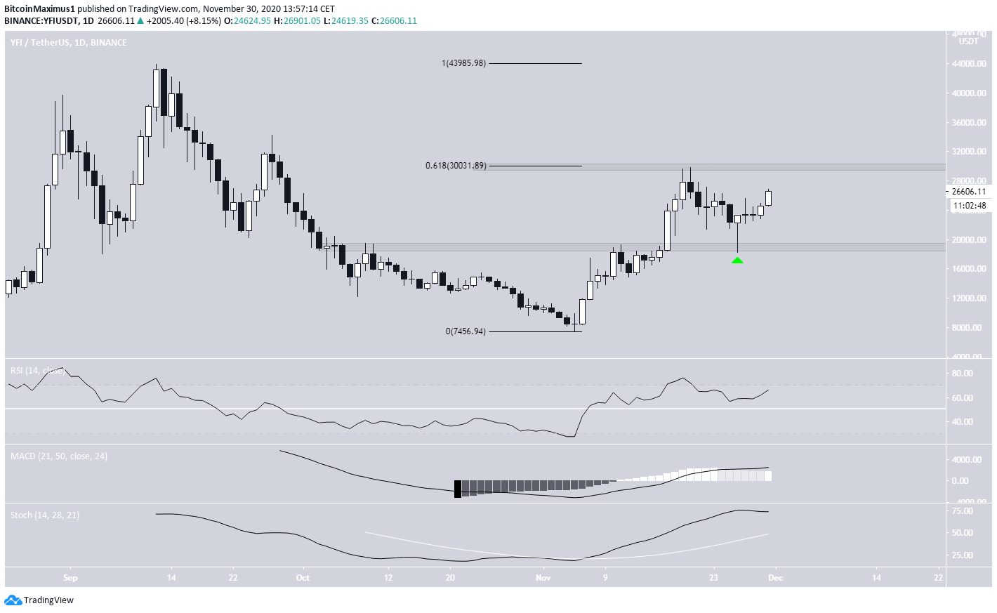Der YFI-Preis erreichte am 20. November einen Kurs von 29.890 USD, bevor es zu einer scharfen Korrektur kam. Am 26. November testete der Preis mit einer bullischen Hammer-Candle erneut den Support bei 19.000-USD und ist seitdem gestiegen.