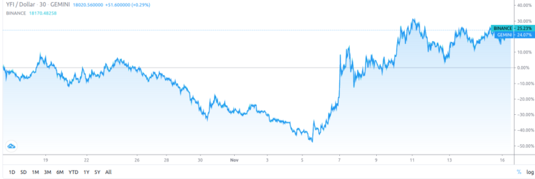 Die Preise für YFI sind jedoch von einem Tief von 7.451 USD am 5. November auf 18.099 USD zum Zeitpunkt des Schreibens gestiegen, obwohl sie von einem Allzeithoch von 43.966 USD am 12. September gesunken sind.