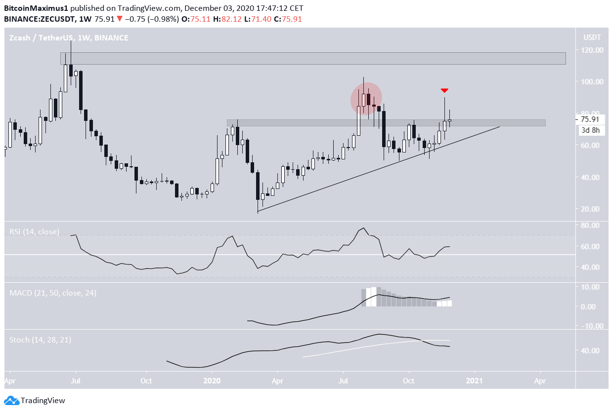 Der ZEC-Kurs wurde traf in der Vergangenheit bereits mehrmals auf die Resistance bei 75 USD. Abgesehen von einem Pump im August, auf den eine schnelle Korrektur folgte, war dieses Widerstandslevel seit Anfang des Jahres 2020 intakt.