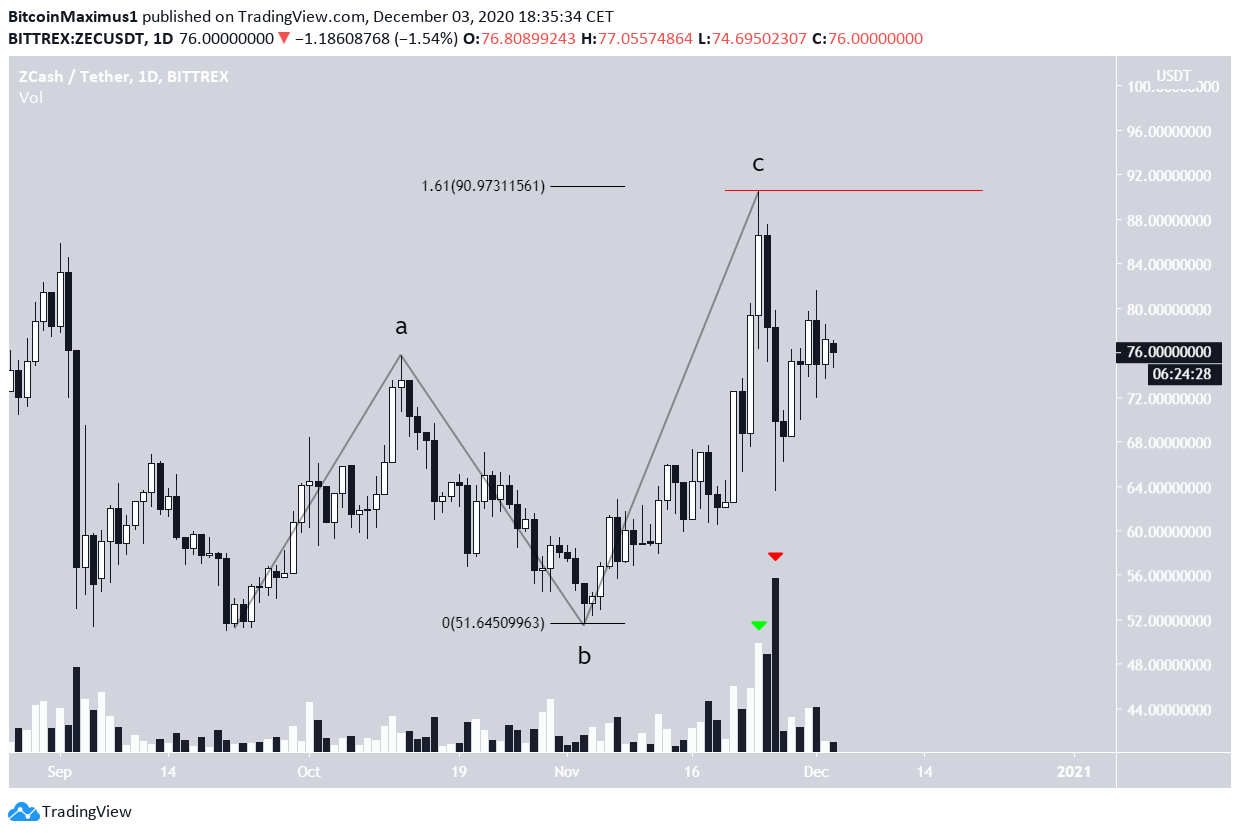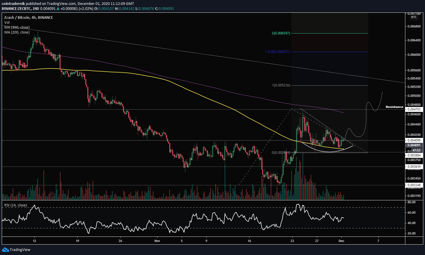 Auf dem Tageschart für ZEC sieht man, dass der Preis am 24. November kurz vor dem 0,786 Fib-Level aufgehört hat, anzusteigen und seitdem fällt. Möglicherweise war die bisherige Aufwärtsbewegung seit September nur eine kurzfristige Korrektur des bisher langfristigen bärischen Trends.