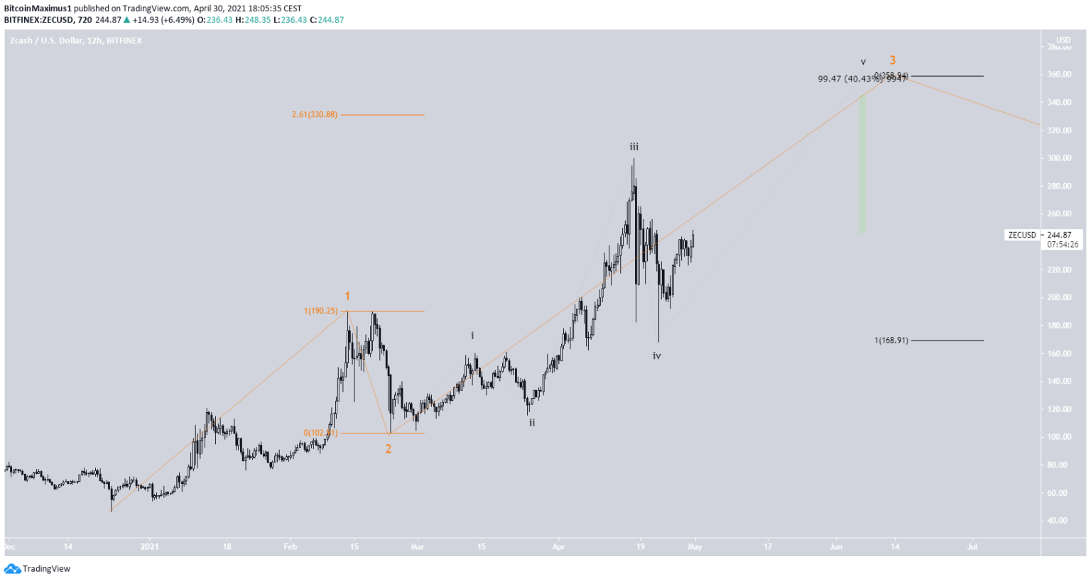 Der ZEC Kurs befindet sich wohl gerade in der fünften Teilwelle (Schwarz) der dritten Welle (Orange) eines bullischen Impulses.