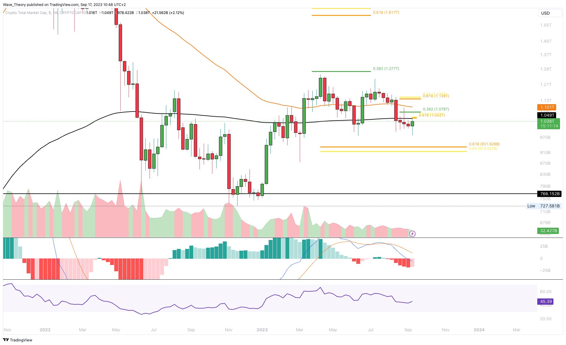 Denn dann könnte der Krypto-Markt zur Golden Ratio Unterstützung bei rund 915 Milliarden USD korrigieren. Solange diese Unterstützung hält, bleibt die Aufwärtsbewegung auch mittelfristig bullisch intakt. Ansonsten könnte der Kurs auf den letzten Tiefpunkt bei rund 727 Milliarden USD zurückfallen.
