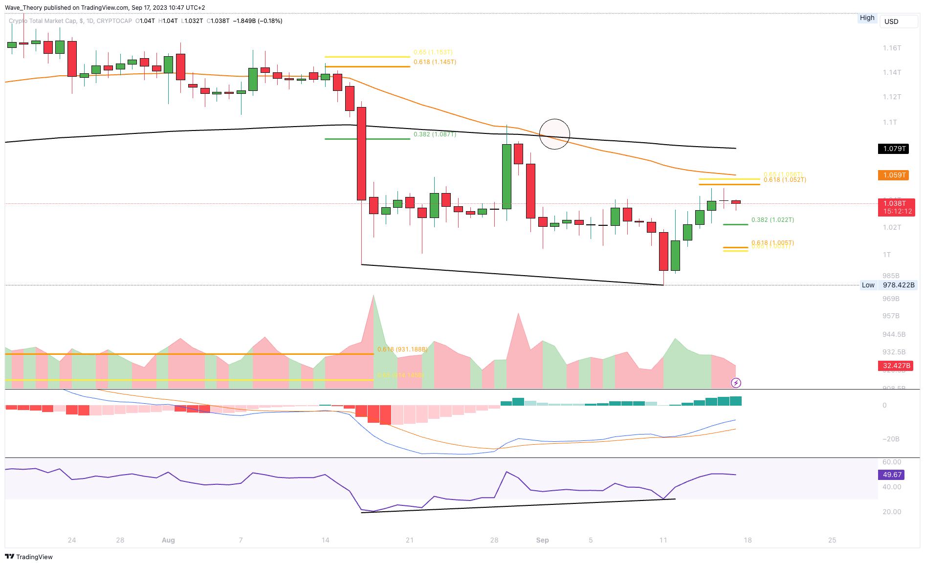 Der Krypto-Markt konnte sich in den letzten sechs Tagen um knapp 7,2 % erholen, nachdem der RSI eine bullische Divergenz im Tageschart abgezeichnet hatte. Doch jetzt scheint der Krypto-Markt bereits wieder an seine Grenzen zu stoßen. Denn den Golden Ratio Widerstand bei rund 1,055 Billionen USD scheint der Kurs nicht brechen zu können. Stattdessen scheint der Kurs eine Korrektur einzuleiten, womit der Kurs jetzt zu den nächsten Fibonacci Unterstützungen bei rund 1,022 Billionen USD respektive 1,005 Billionen USD korrigieren könnte.