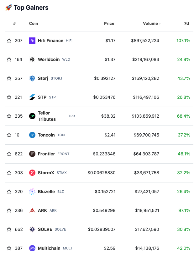 Die zwölf Coins mit den stärksten Kursgewinnen in den letzten sieben Tagen laut Coingecko, ein nützliches Krypto-Tool, bewegen sich im Bereich von rund 25 % und 107 %. Demzufolge gab es in den letzten sieben Tage wieder starke Kursgewinne. Insbesondere Hifi Finance, der Coin mit den stärksten Kursgewinnen, fällt dabei durch sein hohes Handelsvolumen auf. Der Coin konnte in diesem Monat bisher über 612 % steigen – und das, obwohl der Monatsbeginn erst zwei Wochen zurückliegt.