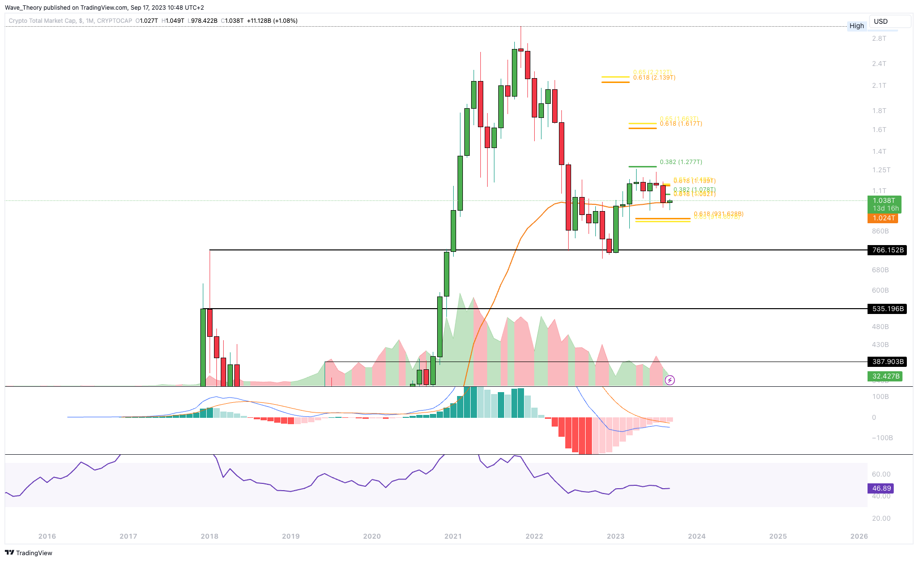 Aktuell findet der Krypto-Markt am 50-Monate-EMA bei rund 1,024 Billionen USD Unterstützung. Dort scheint der Kurs bullisch abprallen zu können. Dementsprechend besteht kurz- bis mittelfristig die Chance auf eine Fortsetzung der Aufwärtsbewegung.