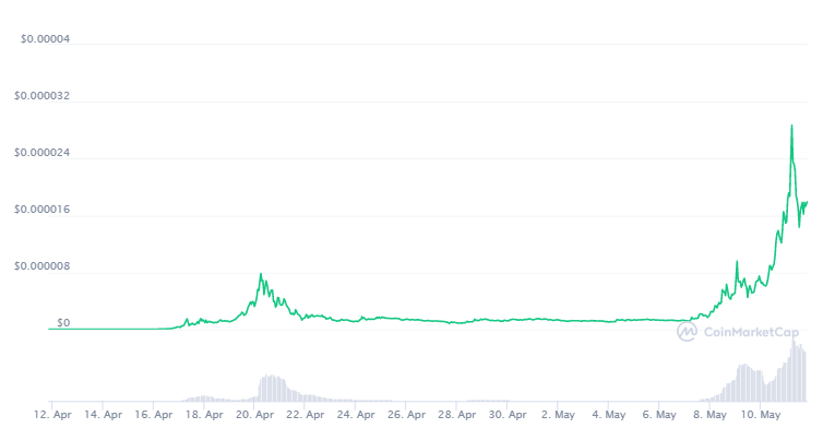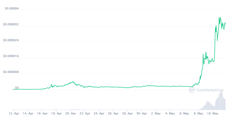 Erst kürzlich stieg SHIBA INU auf ein Allzeithoch bei 0,0000388 US-Dollar, möglicherweise vom Dogecoin Hype und der Altcoin Season getrieben.